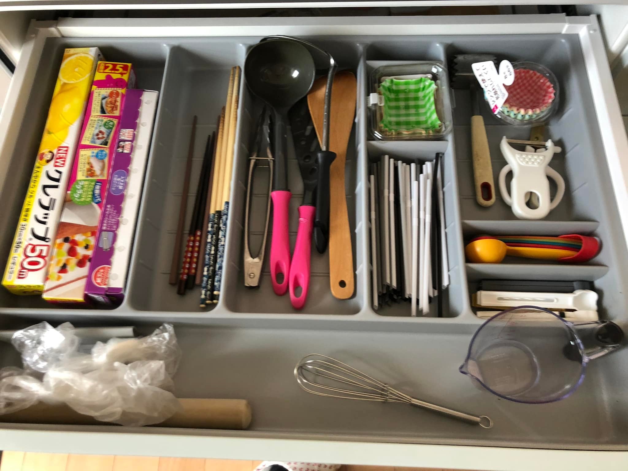 シンク下の引き出し1段目は、毎日よく使うものを種類別に分けて元々あった仕切りを使って収納しました。