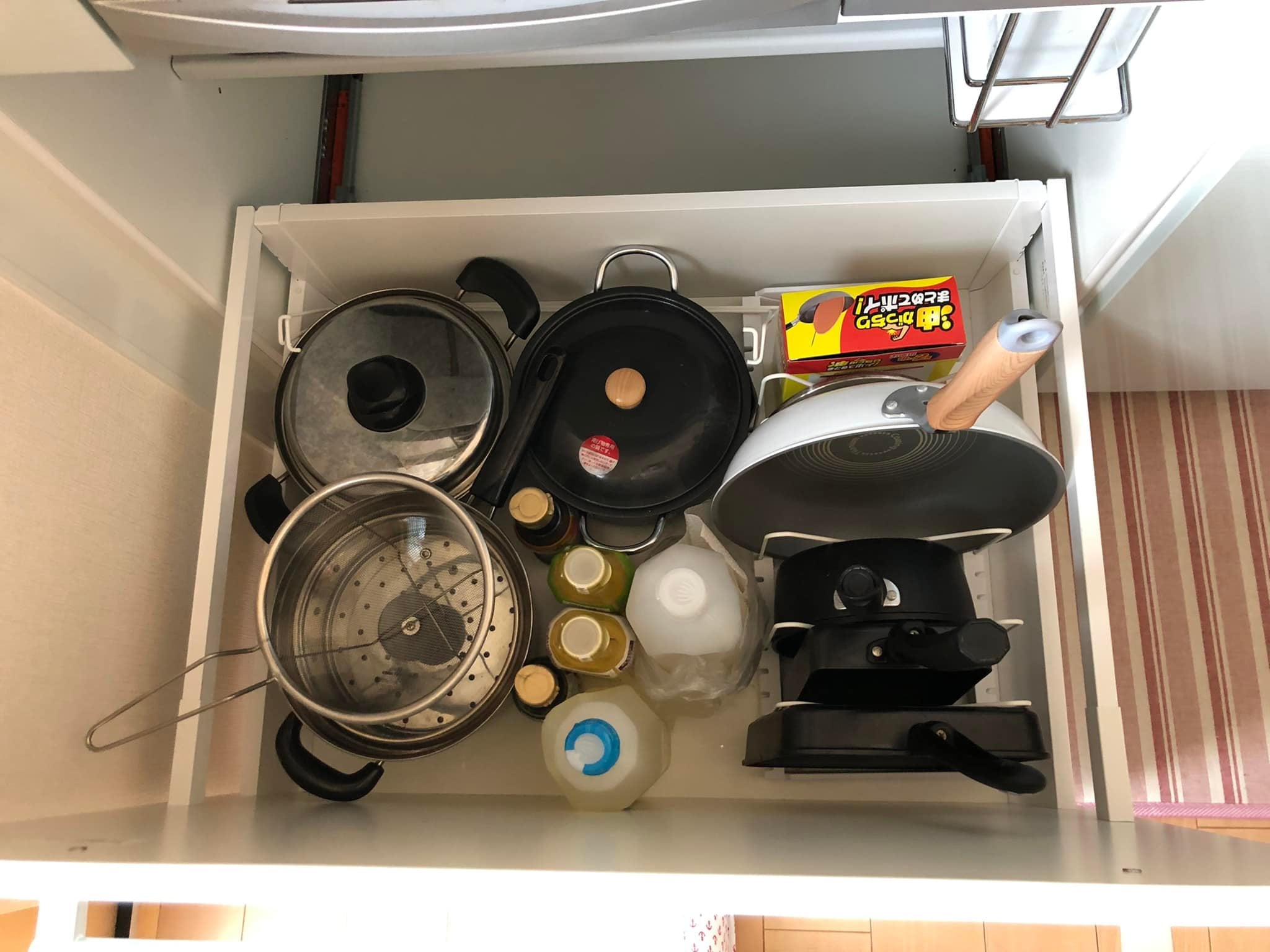 コンロ下の深い引き出しは、上から見て何がどこにあるかわかりやすく、フライパンなどは立てて取り出しやすく収めました。